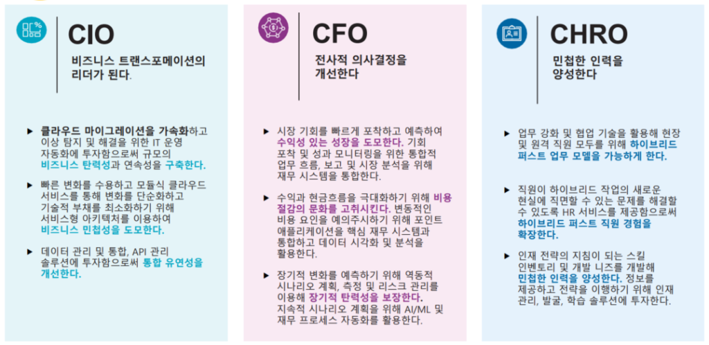 “CIO는 클라우드 기반 기술을 적용해 기업의 디지털 이니셔티브를 조율하면서 비즈니스 전환을 리드해야 하며, CFO(최고재무관리자)는 데이터에 기반한 자동화된 의사결정을 통해 전략적 운영적 차원에서 전사 의사 결정을 개선하고 시간을 단축하는 방안을 검토해야 하죠. 또 CHRO(최고인사책임자)는 하이브리드 퍼스트 업무 모델을 지원하며 협업 및 생산성 솔루션을 통한 직원 경험 확장으로 민첩한 인력을 양성을 위해 노력해야 합니다. 각각의 역할도 중요하지만 디지털 전환을 위한 통합적 접근이 매우 시급한 상황에서 CIO, CFO, CHRO가 긴밀히 협력해서 여러 부문을 아우르도록 디지털 전환 노력을 정렬시키고 디지털 인재 관리 뿐만 아니라 인사 및 재무 프로세스를 통합하기 위해 노력할 필요도 있습니다.”