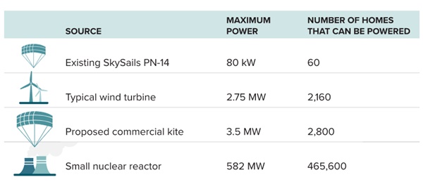 스카이세일즈파워 PN-4 시스템의 경우 현재 최대 발전 출력 80kW로 60가구에 전력을 공급할 수 있다.