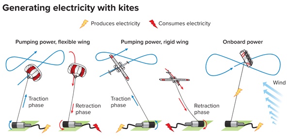 대신 그들은 연의 공기역학을 이용해 연을 바람을 가르며 앞뒤로 움직이는 보트처럼 옆바람 패턴으로 날게 된다. 이 연들의 날개는 바람의 방향에 수직되게 날면서 떠오르고 지상과 연결된 줄(테더)을 더 세게 잡아 당긴다.