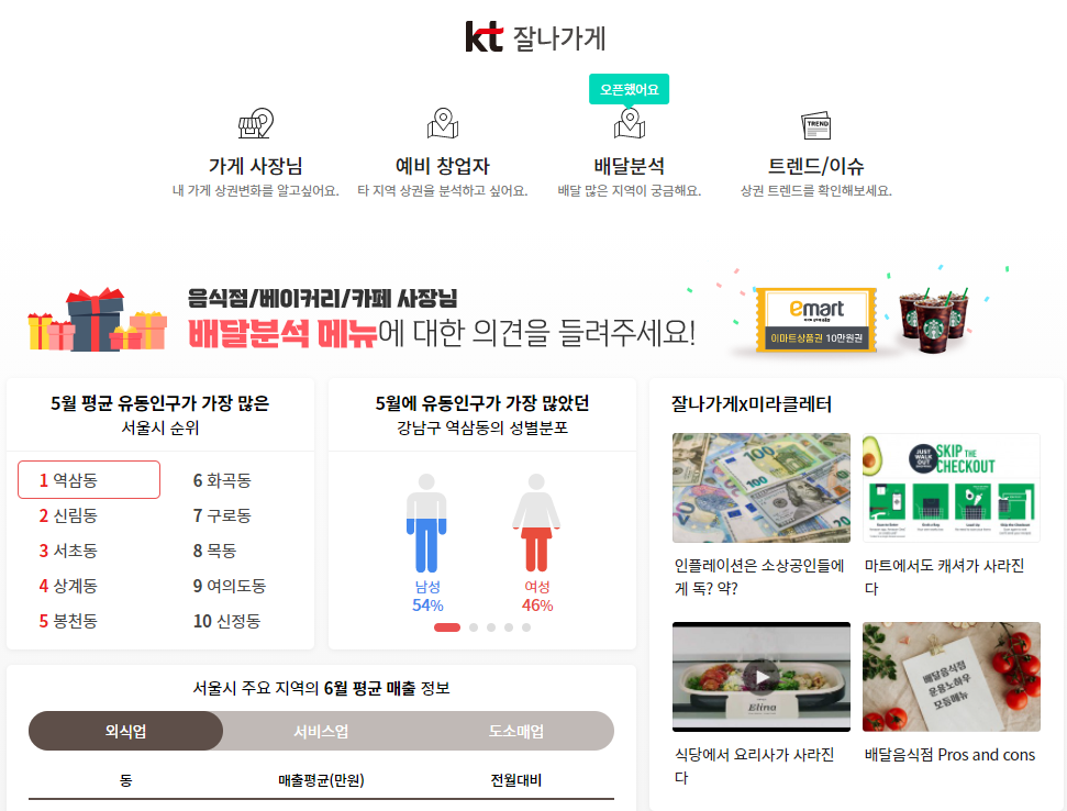 한편 KT는 소상공인 대상 무료 빅데이터 상권분석 플랫폼 ‘잘나가게(jalnagage.kt.co.kr)’를 통해 기존 사업주 뿐 아니라 예비 창업자를 위한 상권분석 서비스를 제공하고 있다.