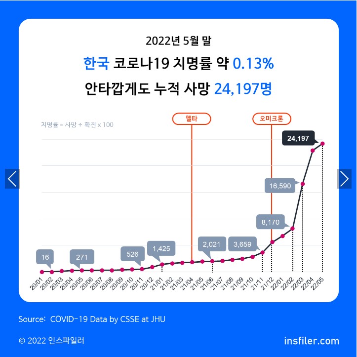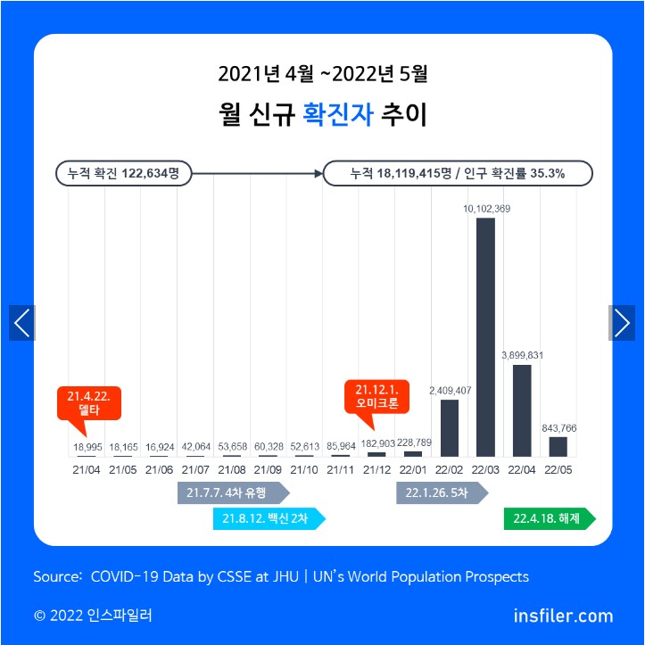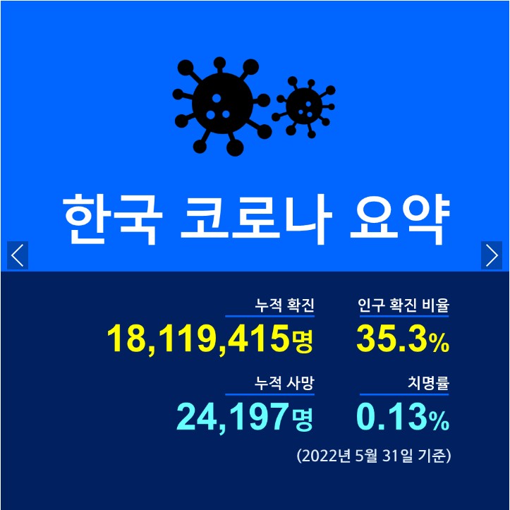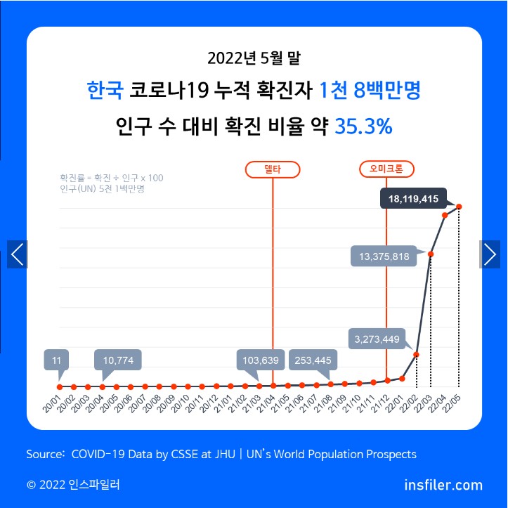 2022년 5월 말 한국의 코로나19 누적 확진자는 1천 8백만명입니다.