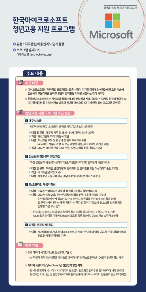 지자체 파트너십 프로그램도 활발히 운영한다. 한국MS는 2021년부터 대구시와 ‘대구 AI 스쿨’을 운영해 AI·디지털 분야 취업을 희망하는 지역 청년 약 220명에게 실무 프로젝트를 수행해보는 기회를 제공해왔다. 더불어 일자리 박람회, 디지털 이력서 작성 등 취업 관련 컨설팅 및 국제공인 자격증 취득도 지원했다.