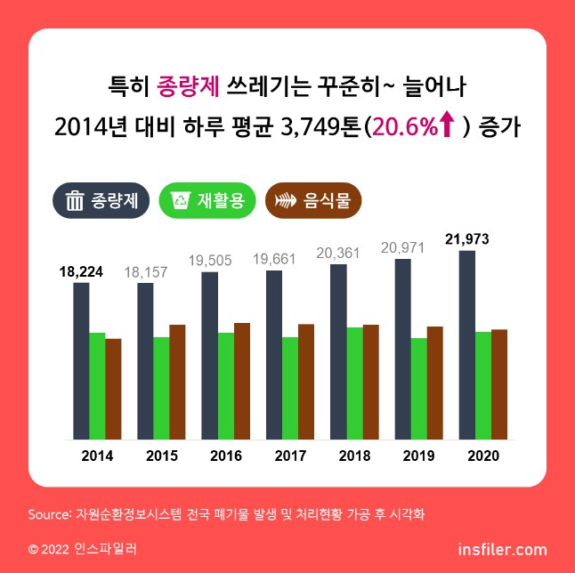 2014년 대비 2020년에는 하루 평균 3,749톤(20.6%) 증가했습니다.