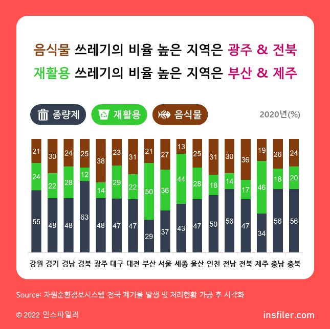 재활용 쓰레기의 비율 높은 지역은 부산 & 제주입니다.