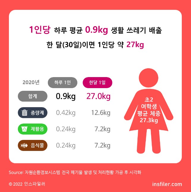 총 배출량을 환산하면, 하루 한 사람이 0.9kg 생활 쓰레기를 배출합니다.
