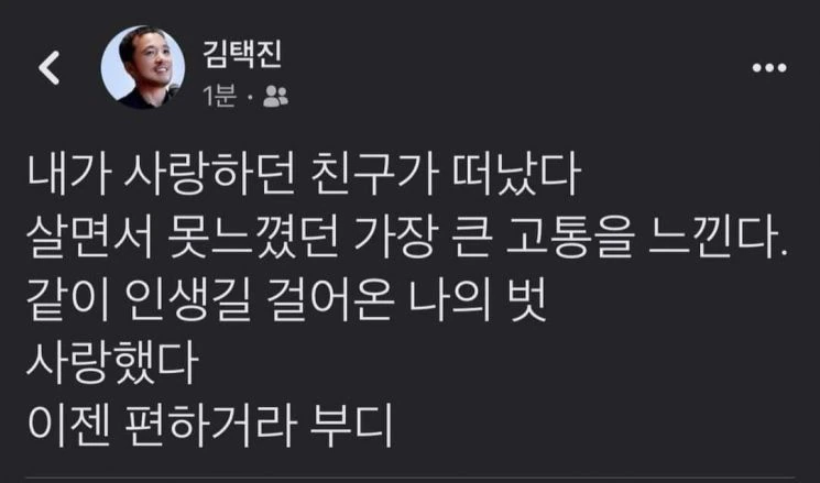 김정주 넥슨 창업주의 부고가 알려진 1일, 생전 고인과 막역했던 김택진 엔씨소프트 대표가 자신의 페이스북에 회환이 가득한 애도의 글을 남겼다. (이미지=김택진 대표 페이스북)