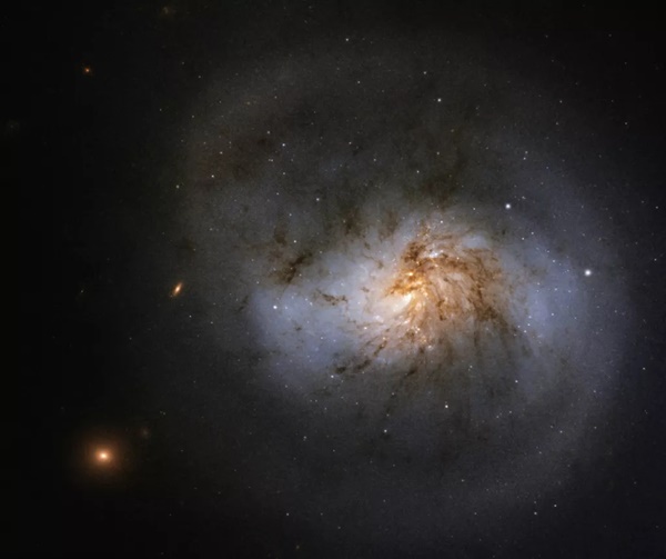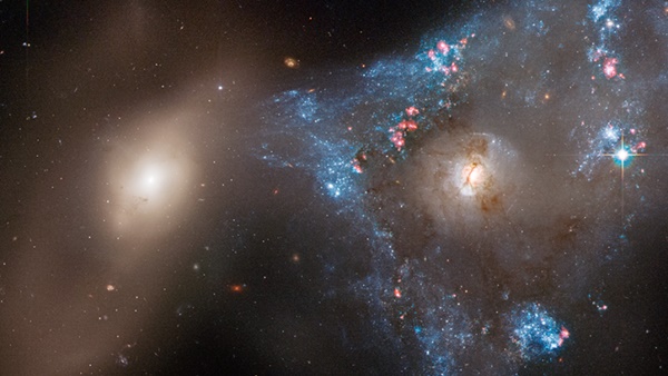허블 팀 관계자는 이 사진에 대해 “이 시스템에 있는 두 은하가 정면으로 충돌하면서 삼각형 모양의 별(항성) 폭발을 부채질했다. 두 은하는 항성을 생성하는 왜곡된 나선 은하 ‘NGC 2445’(오른쪽)와 덜 빛나는 동반 은하 ‘NGC 2444’다”라고 설명했다.
