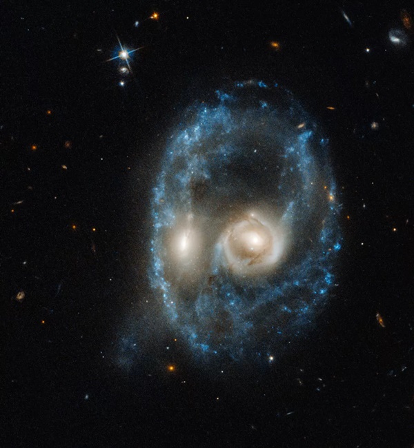 나사가 2019년 10월 28일 할로윈에 맞춰 공개한 이 허블 망원경 사진에서 빛나는 눈을 가진 무시무시한 얼굴이 깊은 우주를 응시하고 있다. 이 으스스한 우주얼굴의 꿰뚫어보는 듯한 눈은 정면 충돌 중에 있는 멀리 떨어진 두 은하의 밝은 중심부이며, 각각의 은하 원반에서 떨어져 나온 혼란스런 별들로 둘러싸여 있다.