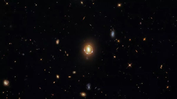 이 입이 떡 벌어지게 하는 ‘아인슈타인 고리’ 사진은 우주의 먼 곳에서 오는 빛을 확대해서 보여주고 있다. 이 사진에서 지구에서 약 34억 광년 떨어져 있는 두 은하는 뒤틀리고 훨씬 더 먼 은하로부터 오는 빛을 꺾는다. 그로부터 나오는 패턴은 이미 1915년에 앨버트 아인슈타인에 의해 예측된(빛이 중력에 의해 왜곡된다) 것인데, 6개의 빛의 지점을 보여준다. 두 개는 중심에 모여 있고 네 개는 왜곡된 빛의 고리 주위에 꿰어져 있다. 그러나 이 밝은 6개의 점들은 6개의 은하에서 온 것이 아니라 3개의 은하에서 온 것이다. 고리 중심에 있는 2개, 그리고 3번째 것이 그것인데 세 번째 것은 먼 퀘이사에서 온 것으로서 너무 많이 구부러져 4개로 보인다.