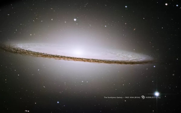 솜브레로 은하로도 알려진 NGC 4594의 가장자리 사진은 두꺼운 먼지 통로에 둘러싸인 빛나는 흰색 핵을 보여준다. 2017년에 공개된 이 사진은 허블 관측으로 조립된 가장 큰 모자이크 중 하나다.