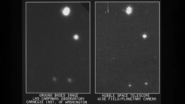 허블 망원경이 우주의 놀라운 사진들을 포착하는 작업을 시작하기 전에 망원경의 첫 번째 일은 기기들을 테스트하고 모든 것이 제대로 작동하는지 확인하는 것이었다. 오른쪽은 허블이 찍은 첫 번째 사진인데, 이 사진은 성단 NGC 3532에 있는 8.2 등급의 별(항성) HD96755에 초점을 맞추고 있다. 왼쪽은 지상 망원경으로 찍은 하늘의 같은 부분 이미지다. 1990년 5월 20일 공개된 허블의 ‘광시야 행성 카메라’는 대기가 시야를 가리는 지구의 천문대와 비교해 허블의 가시성이 향상되었음을 보여준다. 나사는 발표문에서 “허블 망원경의 이상 현상을 설명하더라도 우주 망원경의 이미지(오른쪽)는 지상 관측에서 일반적으로 가능했던 것보다 더 선명하다”고 밝혔다.