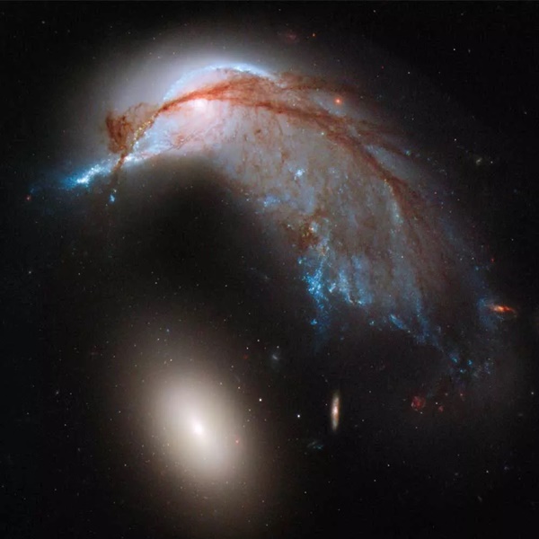 은하들 간의 정면 충돌 모습이 허블 우주 망원경의 새로운 촬영 이미지에 포착됐다. 이 충돌은 심우주 공간에 별의 형성과 함께 반짝이는 거대한 우주 삼각형(사진)을 형성했다.