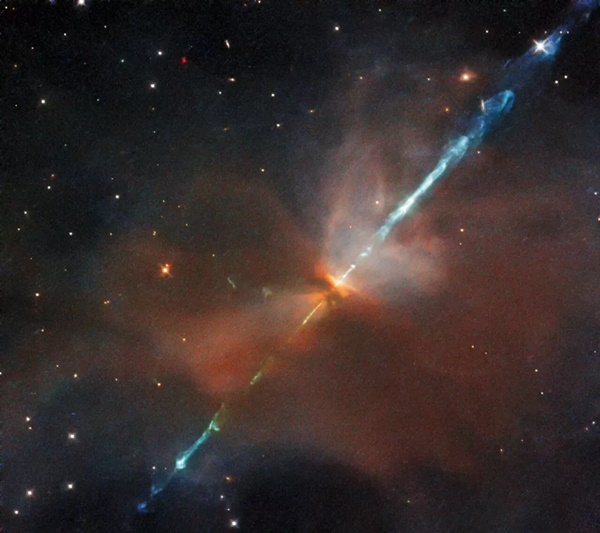 허블 우주 망원경이 포착한 멋진 새 사진에서 불타는 푸른 검이 거대한 우주 심장을 꿰뚫는 것처럼 보인다. ‘검’은 ‘IRAS 05491+0247’이라고 불리는 신생 별의 반대편 극에서 우주로 날아가는 과열되고 이온화된 가스의 쌍둥이 제트로 구성돼 있다. 허블 연구팀에 따르면, ‘심장’은 원시별을 둘러싸고 있는 남은 먼지와 가스의 구름이다.