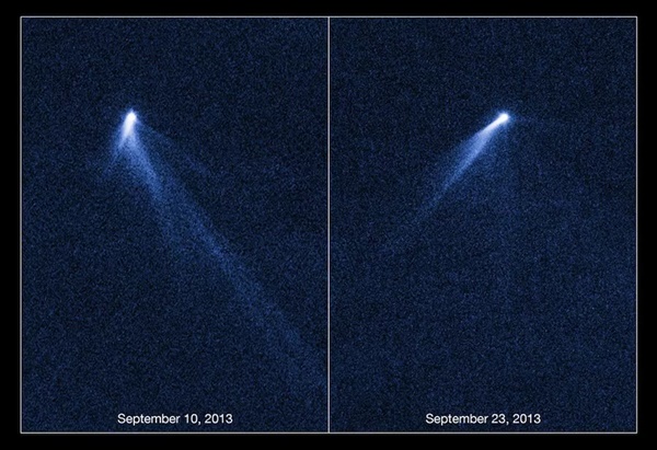 이 일련의 사진들은 2013년 허블 우주 망원경이 관측한 소행성 ‘P/2013 R3’가 산산조각 나는 모ㄹ습을 보여준다. 이 사진은 그런 천체가 이런 식으로 부서지는 것을 처음 촬영한 것이다. 2014년 3월 6일에 공개됐다.