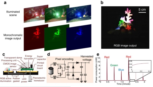 연구진은 이어 전력 소비를 최대한 줄이기 위해 기성품 초저전력 이미징 센서(CMOS)를 사용했지만 이 센서는 회색조의 이미지만 캡처할 수 있었다. 게다가 이들은 크기를 최소화한 카메라용 저전력 플래시도 개발할 필요가 있었다. 대부분의 수중 환경에서는 촬영을 위한 광원이 부족하기 때문이다.