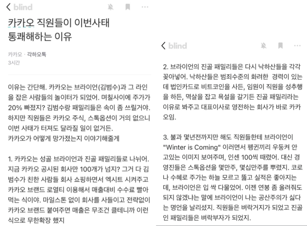 또 게시글에는 “경영진 중심으로 스톡옵션을 뿌렸고, 김범수 의장이 임명한 진골(경영진)과 그들이 투척한 낙하산들이 회사 문화를 망쳐놨다”고 언급하고 있다.