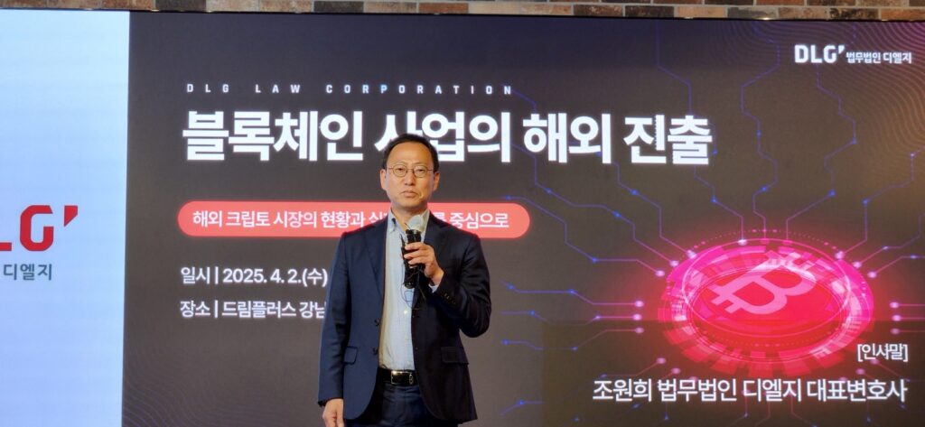 이어진 환영사에서 법무법인 디엘지 조원희 대표변호사는 2017년부터 블록체인 분야에서 쌓아온 경험을 언급하며 “국내 블록체인 산업은 가상자산사업자 신고 수리 및 제도화 노력에도 불구하고 아직 활성화되지 못하고 있는 상황”이라고 진단했다. 그러면서 “최근 글로벌 시장의 긍정적인 변화를 발판 삼아, 해외 시장 진출을 통해 새로운 기회를 모색해야 한다”고 역설했다.