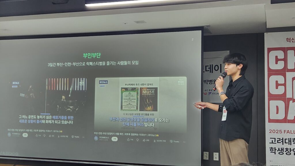 발표를 시작하며 정지용 핸디버스 대표는 “공연장을 가는 길과 집에 돌아오는 길의 시간도 팬들에게는 하나의 축제가 될 수 있다”며 운을 뗐다. 그러면서 3일간 부산–인천–부산으로 락 페스티벌을 즐기는 사람들의 모임, ‘부인부단’ 이용자 사례를 언급했다.