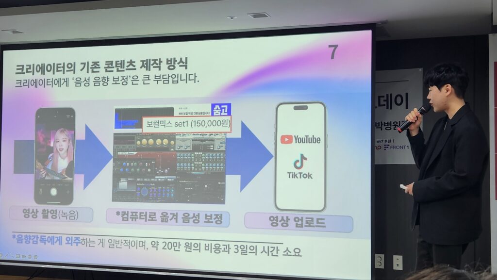 노 대표의 설명에 따르면 실제로 크리에이터들은 영상 촬영 후 음향 감독에게 외주를 맡기고, 이 과정에 2~3일의 시간과 20여만원의 비용이 든다. 그 뒤에 음성과 영상을 합쳐 유튜브나 틱톡의 플랫폼에 업로드하는 것이다. 노 대표는 “이렇게 적잖은 비용과 시간이 필요한 이유는 실제 음성 보정 작업이 어렵기 때문”이라며 말을 이어갔다.