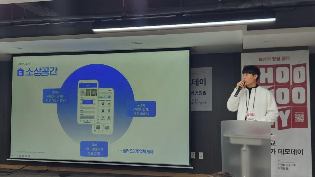 스페이스점프는 자영업 폐업 과정에서 발생하는 중고 기자재 문제를 해결하기 위해 플랫폼 ‘소상공간’을 개발한 팀이다. 배 대표는 “실제 600만 자영업 생태계에서 낙후된 부분을 혁신하고 있다”며 최근 폐업 증가 추세와 중고 기자재 처리 문제를 설명했다.