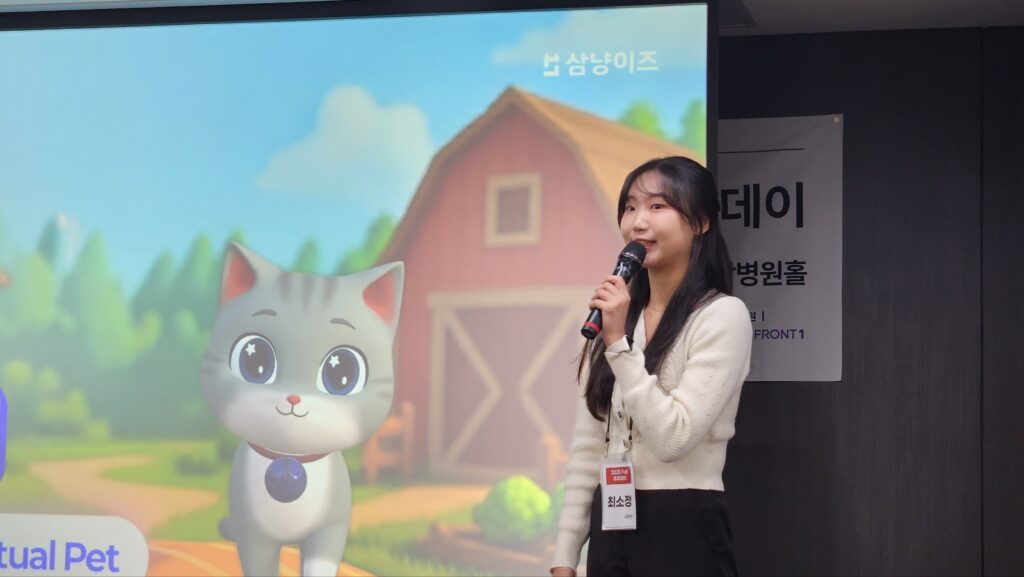 삼냥이즈가 선택한 존재는 ‘고양이’다. 팀원 모두 고양이를 좋아하고, 1인 가구에서 반려동물을 키우기 어려운 현실에서 고양이가 가지는 독립성과 위로의 상징성에 주목했다. 최 대표는 “지금부터 여러분은 리티를 키우는 집사”라며, 먹이를 주고 대화를 나누고 액티비티를 수행하며 자원을 얻는 게임 구조를 소개했다.