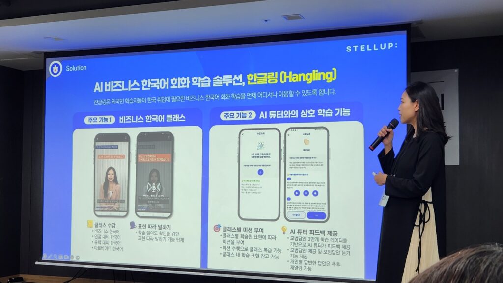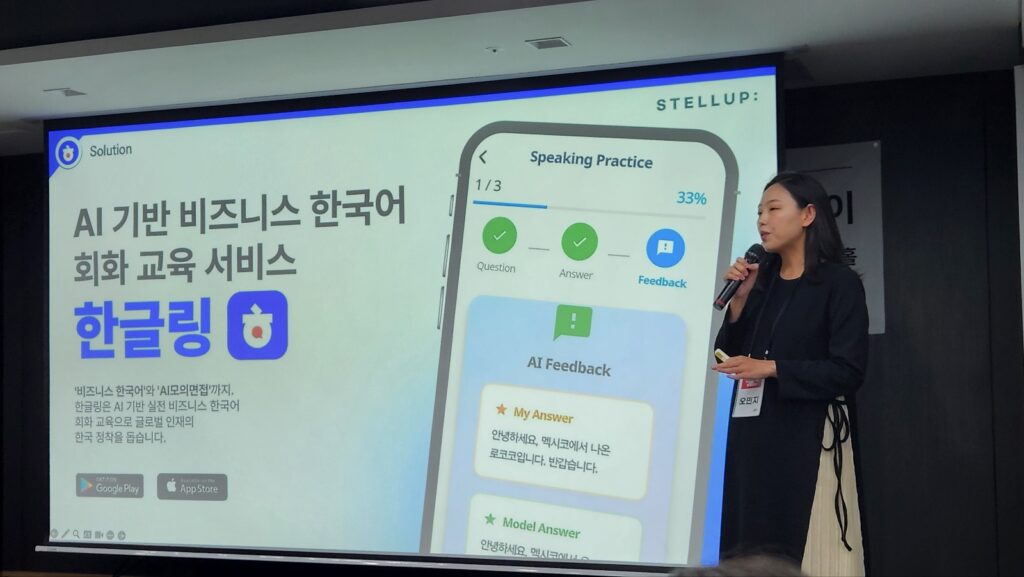 스텔업은 외국인 전문 인력의 국내 정착과 취업을 돕는 한글 교육 서비스 ‘한글링’을 선보인 스타트업이다. ‘한글링’은 초개인화된 학습 설계와 AI 면접 시뮬레이션 기능을 탑재한 비즈니스 한국어 학습 앱으로, 실전 취업에 필요한 회화 능력을 빠르게 습득할 수 있도록 돕는다. 6단계 반복 말하기 훈련과 상황별 비즈니스 회화, AI 기반 실전 모의면접 및 피드백 리포트 제공 등 실제 채용 현장에 대비할 수 있는 학습 환경을 제공한다.