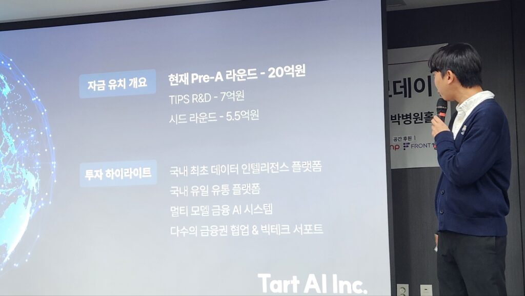 이날 마지막 발표에 나선 박아윤 타르트AI 대표는 지금까지 조달한 12억원의 자금과 현재 진행중인 20억원 규모의 프리A 라운드를 언급하며 “국내 최초로 데이터 플랫폼과 유통 플랫폼을 만들고 진짜 AI 시스템을 만들었다”고 자신감을 드러냈다.