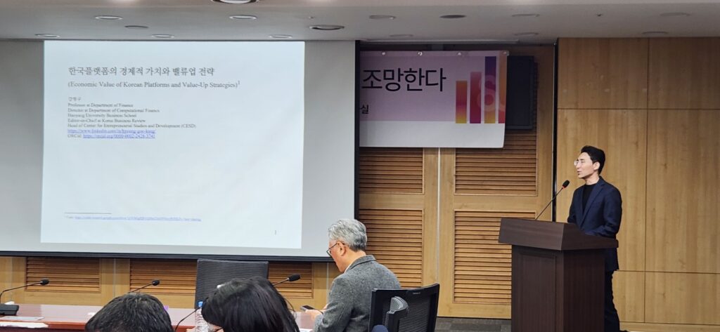 이날 토론회의 첫 순서는 강형구 한양대학교 파이낸스경영학과 교수의 '한국 플랫폼의 경제적 가치와 밸류업 전략'이라는 주제로 발표로 시작됐다.