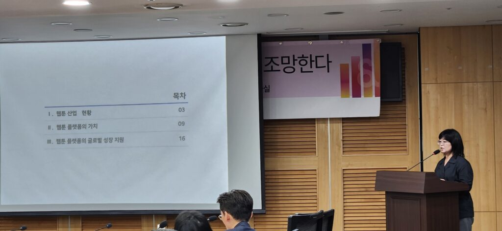 김 대표는 “2023년 기준, 글로벌 만화 시장 규모는 한화 약 17조 원으로 글로벌 시장 내 한국의 점유율은 5위로 경쟁력이 크다”며 “웹툰 생태계에서 대표적인 7개 플랫폼의 매출이 총합 1조 4,094억원에 달하는데 결국 이들을 통해 창작자들이 자기 작품을 유통할 수 있으므로 플랫폼의 역할이 매우 중요하다”고 말했다. 또한 “웹툰산업이 전통적인 만화와 가장 구분되는 점은 플랫폼을 기반으로 성장해 왔다는 점”이라며 “웹툰 플랫폼이 글로벌 각지에서 큰 성과를 내고 있지만 글로벌 빅테크 기업이나 현지 기업들과의 경쟁도 치열해지고 있어, 국내 기업의 자율성과 성장을 최대화할 수 있는 정책 환경 조성이 필요”하다고 주장했다.