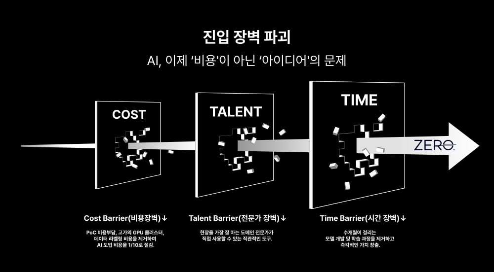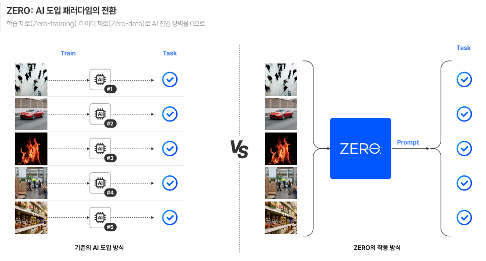 김 대표는 제로를 통해 AI 개발 초기 단계에서의 라벨링, 학습, 모델 구축 등을 생략할 수 있다고 강조했다. 김 대표의 말에 따르면 제로는 방대한 산업 데이터 기반으로 미리 학습되어 있기 때문에, 프롬프트만 입력하면 AI가 곧바로 문제를 해결한다. 사용자는 단순한 텍스트를 프롬프트에 입력하거나 예시 이미지만을 제시하는 것으로 원하는 기능을 바로 실행할 수 있다. 그는 이를 '제로 데이터', '제로 학습', '제로 복잡성', '제로 대기 시간', '제로 한계'라는 다섯 가지 키워드로 요약했다.