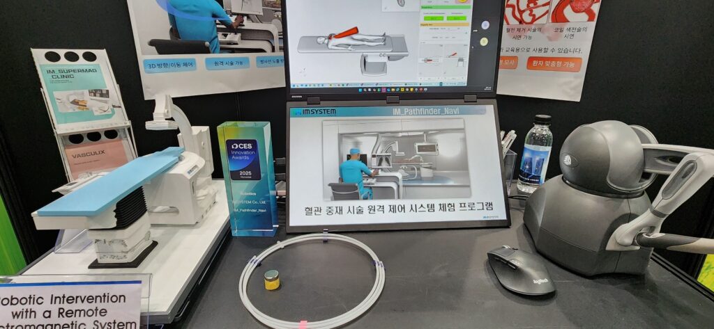 현장에서 만난 정태준 아임시스템 담당자는 “막힌 혈관을 뚫는 시술은 의사가 환자 몸에 직접 와이어를 넣어 손끝 감각으로 진행이 돼 왔다”며 “마이크로 로봇은 수술실 밖에서 원격 조정기 만으로 쉽게 시술을 할 수 있게 한 시스템”이라고 설명했다.