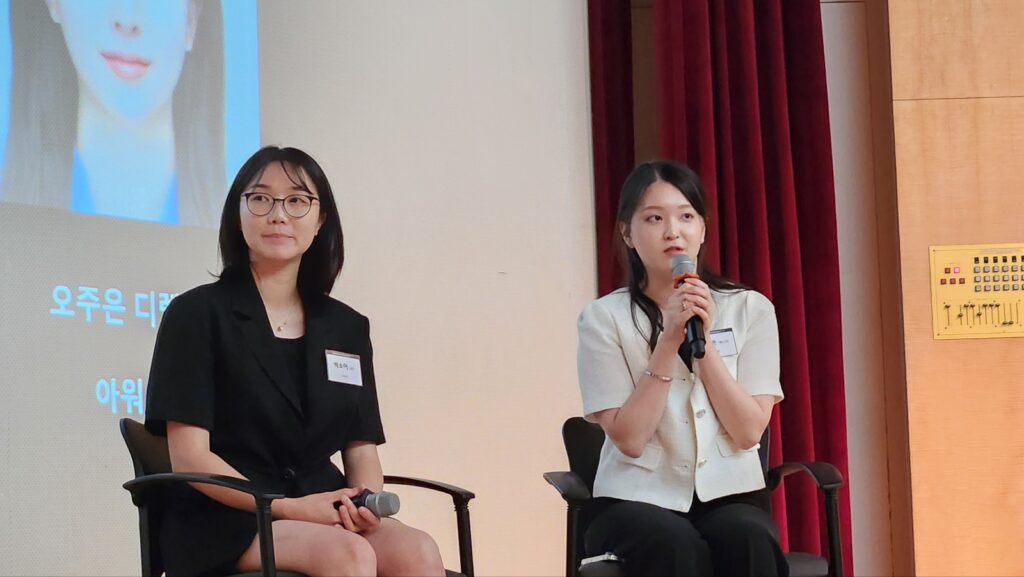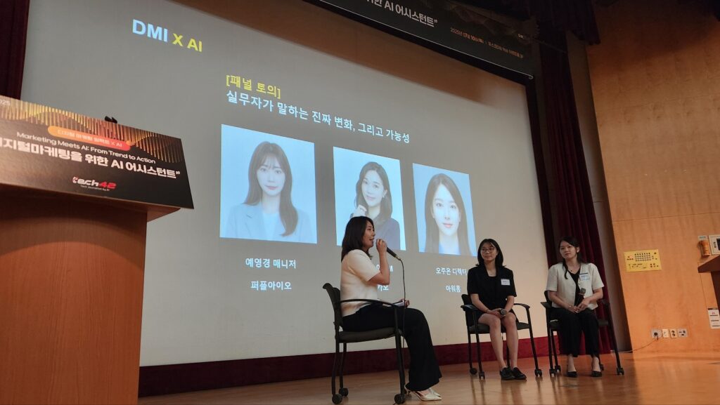 행사 마지막 세션은 ‘마케터의 데스크’라는 주제로 열린 패널토론이었다. 퍼플아이오 예영경 매니저의 사회로, 박소이 카카오 PM과 오주은 아워홈 디렉터가 직접 무대에 올라 실제 실무에서의 AI 활용 경험을 생생하게 공유했다.