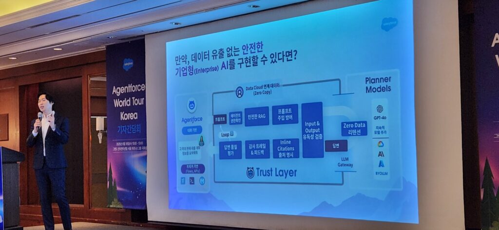 김 아키텍트는 제로카피 기술을 설명과 함께 “데이터를 세일즈포스 플랫폼으로 옮기지 않아도, 참조만으로도 동등한 품질의 AI 서비스를 운영할 수 있다”며 보안성을 강조했다.