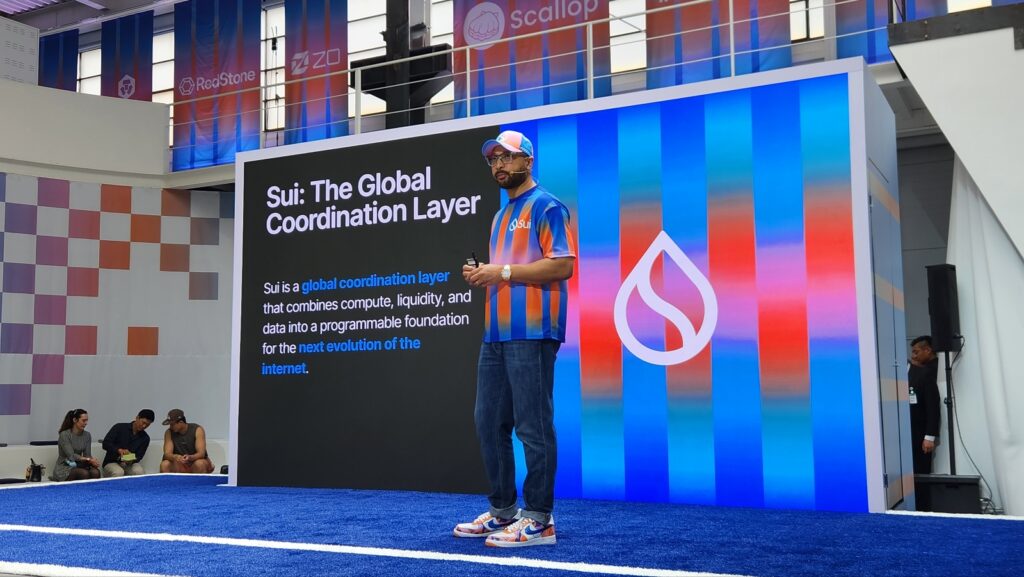 25일 서울 성수동 ‘Layer 41’에서 열린 ‘수이 빌더 하우스 APAC 인 서울(Sui Builder House: APAC in Seoul)’ 현장. 미스틴랩스 공동창업자 아데니이 아비오둔 CPO가 나와 수이와 티오더 간 전략적 업무협약과 차세대 장수 프로토콜 쿠디수의 수이 확장 발표를 하고 있다. (사진=테크42)