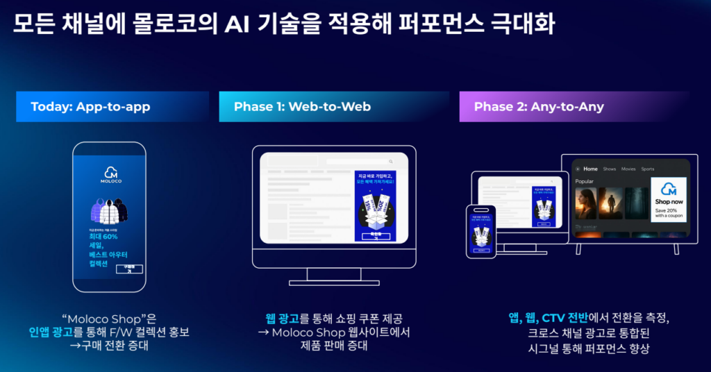 특히 커머스 미디어 분야에서는 국내 상위 20개 커머스 플랫폼 중 60%가 몰로코의 솔루션을 활용하고 있다. 딥러닝, 트랜스포머, TPU 기반 기술을 차례로 도입하며 AI 엔진의 성능을 고도화해온 몰로코는 이제 앱을 넘어 웹과 커넥티드TV(CTV)까지 통합하는 풀퍼널 광고 전략으로 차세대 성장을 도모하고 있다.