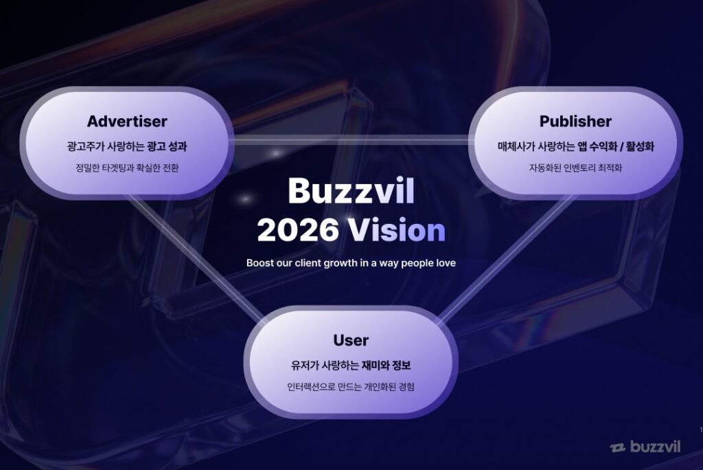 “저희가 만들고 싶은 것은 광고주가 예산과 랜딩 페이지, 목표만 입력하면 모든 것이 AI로 자동 운영되는 구조입니다. 소재도 자동화되고, 매체 배분도 자동화되고, 보상도 동적으로 할당되며, 체리피커 필터링까지 함께 작동하는 그림입니다. 파트너에게는 앱 수익화와 활성화 기회를 제공하고, 광고주에게는 성과를 제공하며, 사용자에게는 혜택과 재미를 제공하는 생태계를 만들고자 합니다. 버즈빌의 미션은 사람들이 좋아하는 방식으로 고객의 성장을 이끄는 것입니다.”