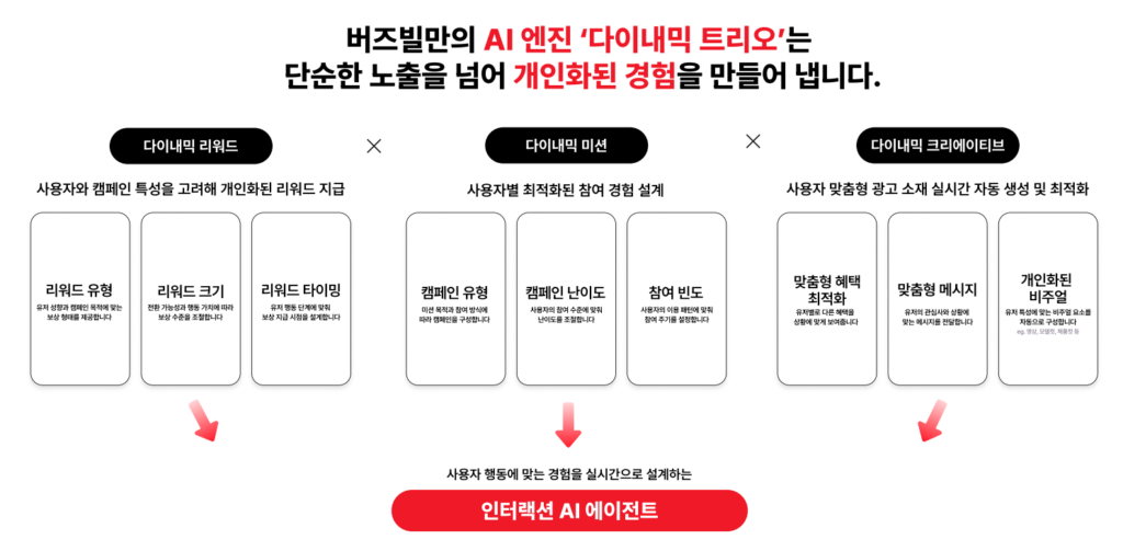 버즈빌이 이날 공개한 다이내믹 트리오 엔진은 이 전략의 핵심 기술이다. 다이내믹 멀티미션은 사용자가 구매 여정에서 어디에 머물러 있는지, 어떤 시점에 이탈할 가능성이 높은지, 어떤 미션을 제공했을 때 다음 단계로 이동할 가능성이 높아지는지를 AI가 분석한다.