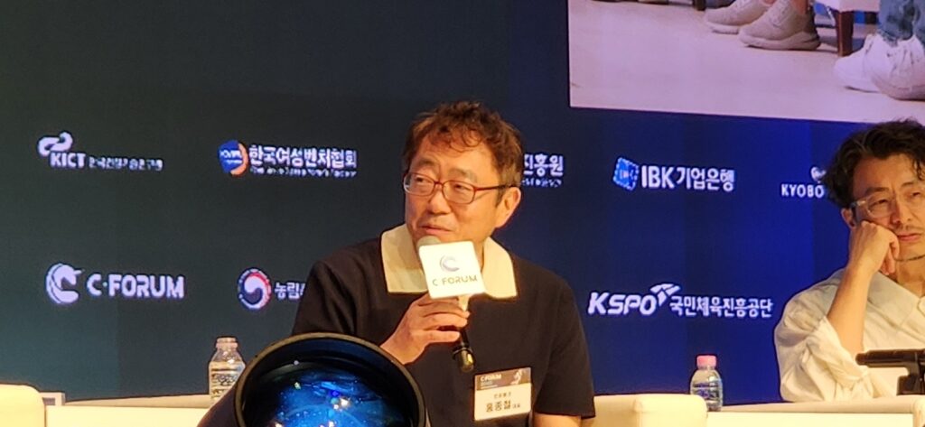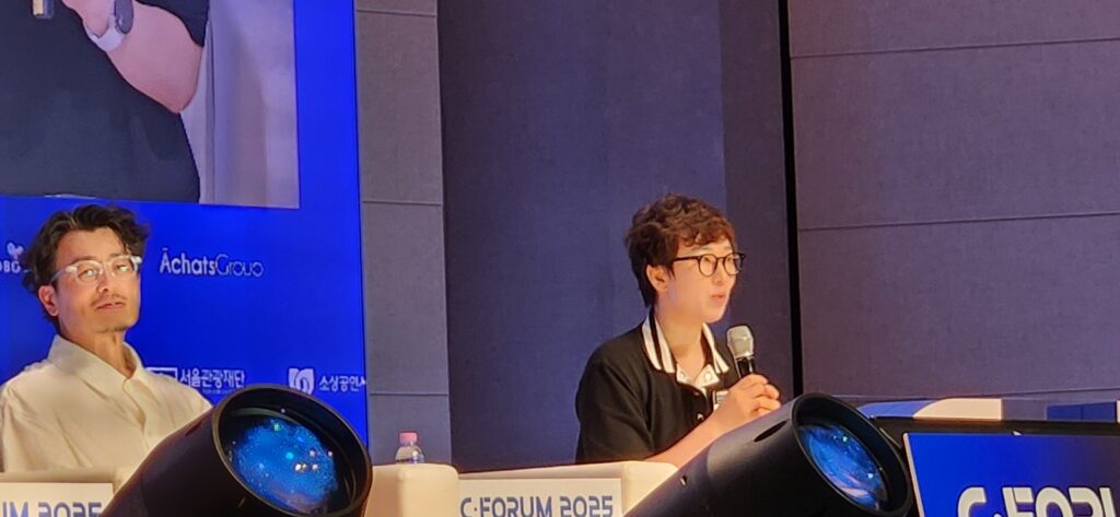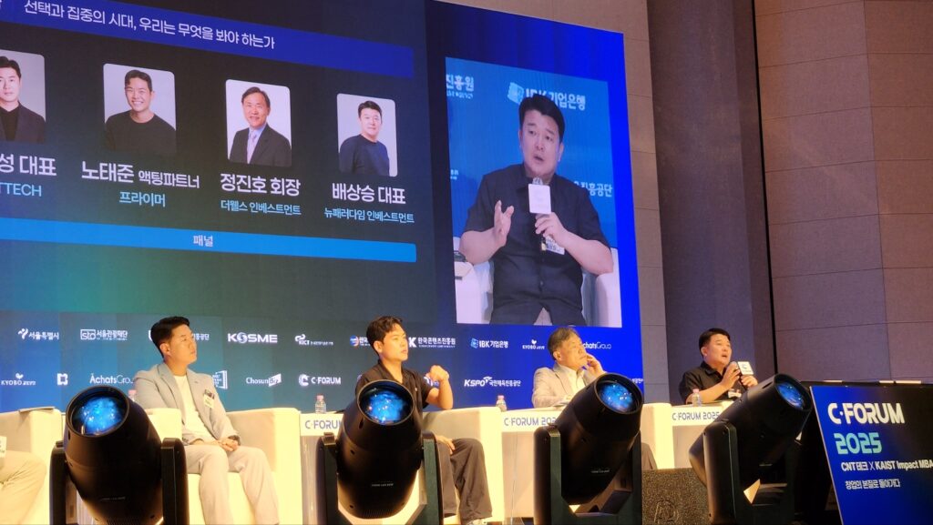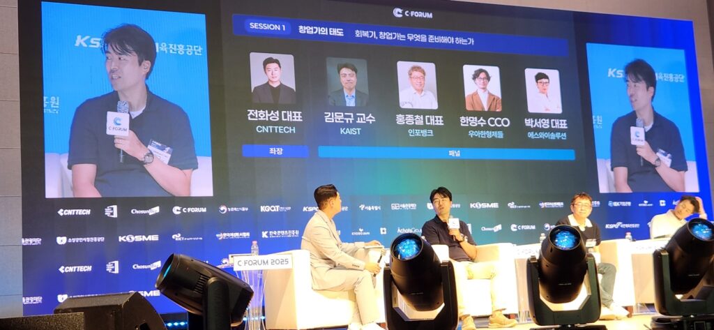 이어진 C포럼 2025의 첫 번째 세션 ‘창업가의 태도’에서는 전화성 대표가 진행자로 나서, 김문규 카이스트 교수, 홍종철 인포뱅크 대표, 한명수 우아한형제들 CCO, 박서영 에스와이솔루션 대표 등을 패널로 한 토론을 진행했다.