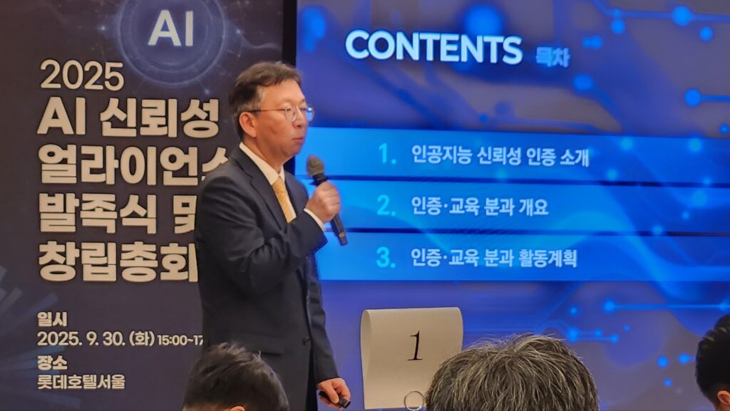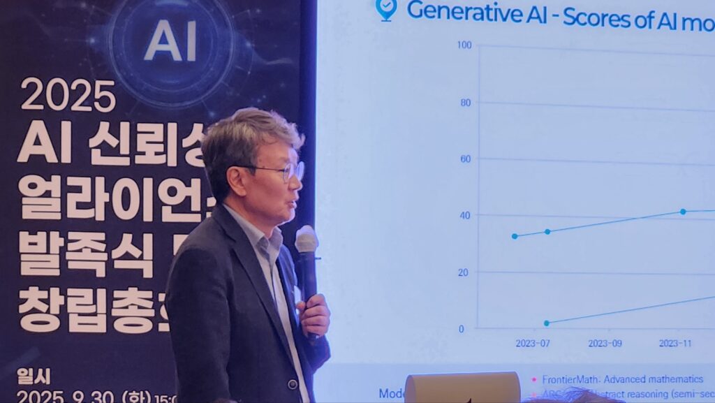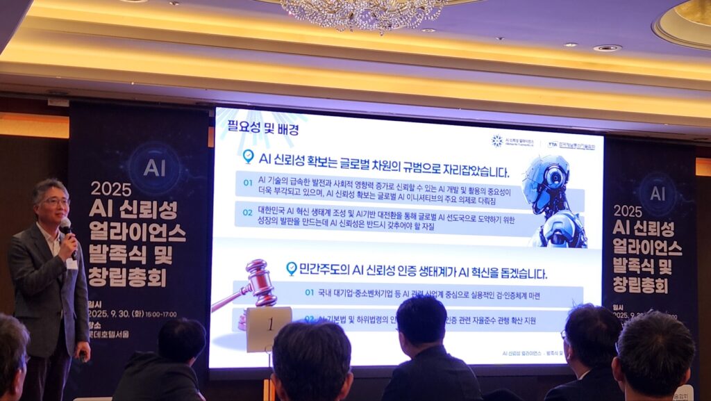 신준호 한국정보통신기술협회(TTA) 단장(AI 신뢰성센터장)은 이날 행사 에서 AI 신뢰성 얼라이언스의 운영 방향을 발표했다. (사진=테크42)