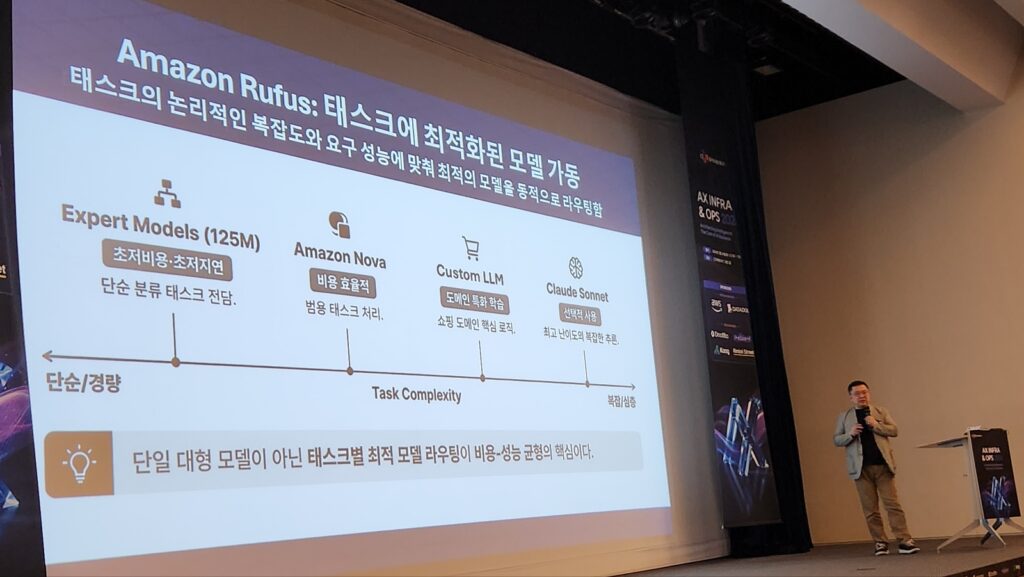 “대규모 사용자 환경에서는 모든 요청을 LLM으로 처리할 경우 비용이 폭증합니다. 2억명이 이런 질문을 하기 시작하면 토큰 비용을 감당할 수가 없습니다. 이에 따라 아마존은 캐싱, 모델 라우팅, 멀티 모델 구조를 통해 대부분의 요청을 최적화된 방식으로 처리하고 있습니다. 대부분의 호출은 LLM을 건드리지 않고, 필요한 곳에만 필요한 모델을 쓰는 구조를 택하는 겁니다. 그게 비용은 줄이고 정확도는 높이는 길입니다. 고객 문제를 풀 때도 비즈니스 성격에 따라 쪼개야 인프라와 비즈니스가 함께 성과를 냅니다.”