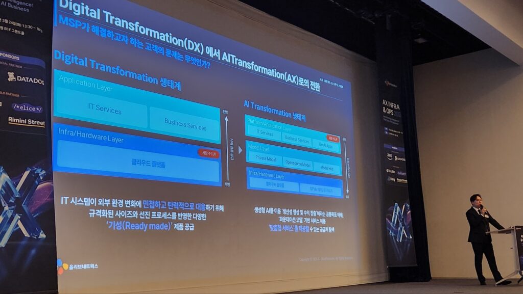 이어 김 팀장은 지금의 상황을 ‘다음 단계’로 규정했다. 클라우드를 기본 조건으로 기업의 고민이 한 단계 위로 올라갔다는 것이다. 과거 DX(Digital Transformation: 디지털 전환) 시기에는 클라우드 도입과 아키텍처 현대화가 핵심이었다면, AX 시대에는 GPU(Graphics Processing Unit: 그래픽처리장치) 인프라, 토큰 비용, 기존 레거시 시스템까지 동시에 관리해야 하는 복합 운영 환경이 중심 과제로 떠올랐다는 것이 그의 설명이다.