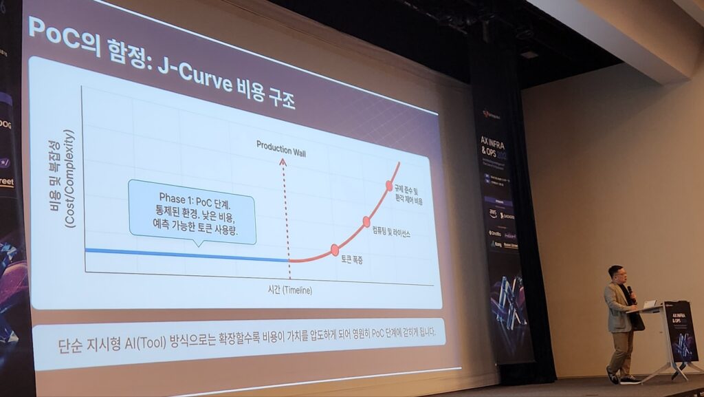 먼저 우 담당은 AI 프로젝트가 파일럿 단계에서 멈추는 이유를 현실적으로 짚었다. PoC(개념검증) 단계에서는 성과가 나오지만, 실제 운영 단계로 넘어가면 비용 증가, 응답 지연(latency), 정확도 문제(환각/hallucination)라는 세 가지 문제가 동시에 발생한다는 것이다.