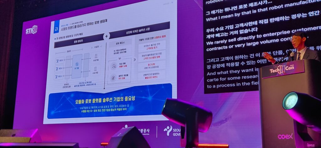 “저는 개인적으로 로봇에서 가장 중요한 것은 로봇 그 자체 보다 고객이 원하는 그 현장에 필요한 애플리케이션이라고 생각을 합니다. 로봇이 실제 현장에서 사용할 수 있게끔 할 수 있는 SI 회사들이 많이 있어야 우리나라 중소기업 중견 대기업뿐만 아니라 국가 경제 발전에 도움이 된다는 거죠. 하지만 글로벌 로봇 성장률이 30%에 육박함에도 불구하고 우리나라 로봇 성장률은 1.5%가 채 안됩니다.”