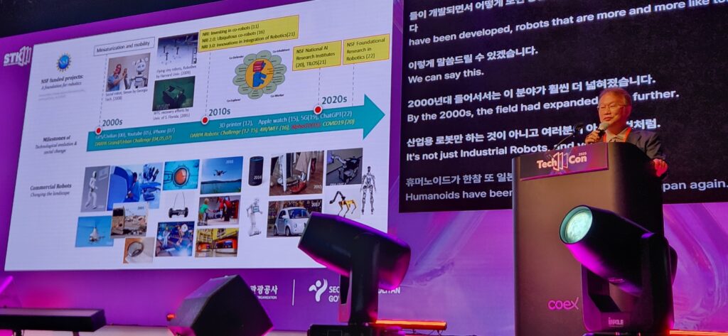 여 박사는 “과거에는 로봇의 산업화가 지능의 한계로 인해 지지부진했지만, 이제 AI 기술이 빠르게 발전하면서 지능형 로봇이 현실화되고 있다”며 “사이버 공간에 머물던 AI가 물리 공간에서 행동하게 되는 시점이 곧 다가오고 있으며, 그 연결 고리가 바로 로봇”이라고 말했다.