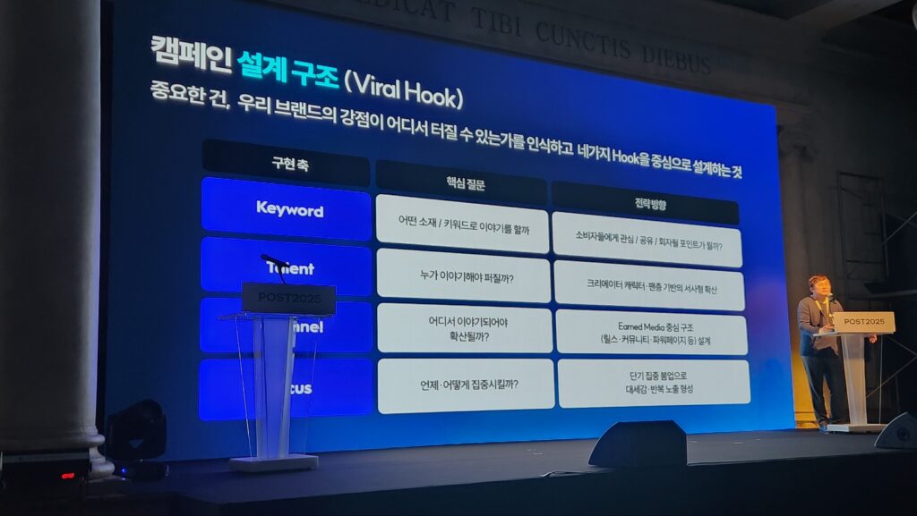 같은 주제로 신 실장에 이어 바톤을 이어 받은 더에스엠씨의 박천홍 디렉터는 변화된 디지털 마케팅 환경을 언급하며 실제 캠페인 사례로 바이럴 훅(Viral Hook, 캠페인 설계구조) 의 중요성을 강조했다.