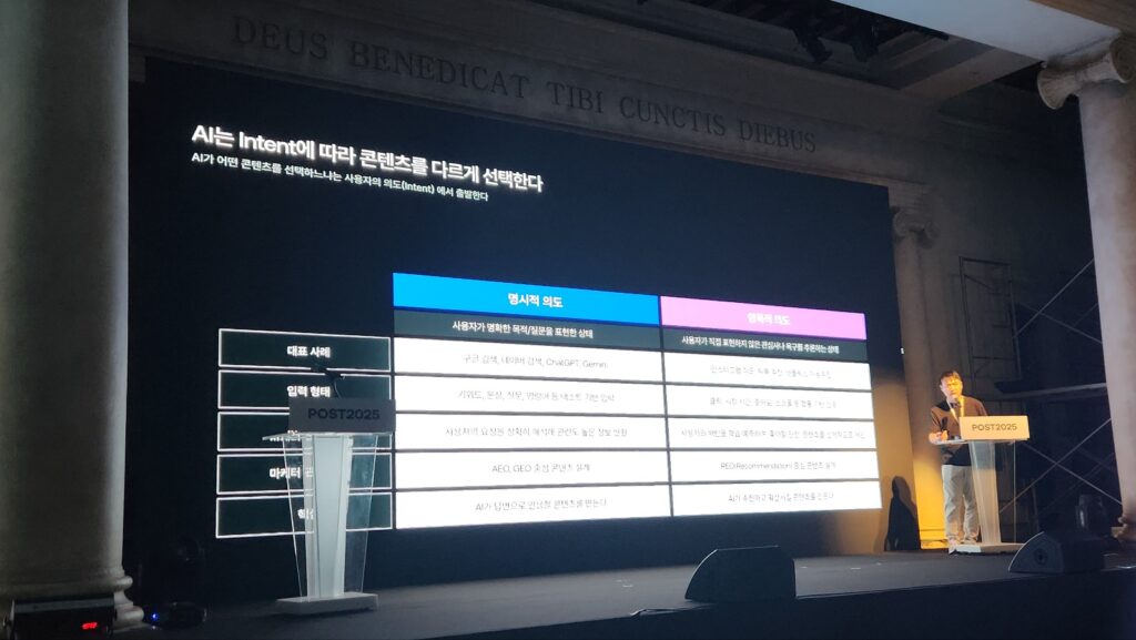 그러면서 김 CTO는 AI의 콘텐츠 선택 방식을 명시적 의도와 암묵적 의도로 나눴다. 명시적 의도는 사용자가 명확한 목표로 키워드를 입력하는 것으로 GPT나 구글 검색이 해당된다. 여기서는 AEO가 중요하며, AI가 답변으로 인용할 콘텐츠를 만드는 게 목표다.