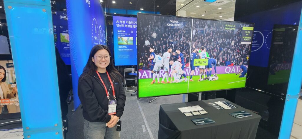 현장에서 만난 이제현 블루닷 매니저는 “실시간을 화질을 개선하고 특정 피사체나 인물을 선택해화질을 향상시킬 수도 있다’고 강조하며 “AI 반도체 제조사들을 비롯해 방송사들과도 협업을 진행하고 있다”고 설명했다.