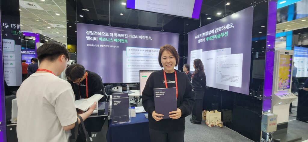 리걸테크 기업 BHSN(비에이치에스엔)은 지난해에 이어 올해 두 번째로 AI 엑스포에 참가하며 자사의 고도화된 리걸 AI 기술을 소개했다. BHSN은 비즈니스 계약 및 법무 업무의 효율화를 위한 인공지능 솔루션 ‘앨리비(ALLYB)’를 중심으로 CLM(계약관리), ELM(기업 법무), 비즈니스 에이전트 등 다양한 서비스를 선보였다.