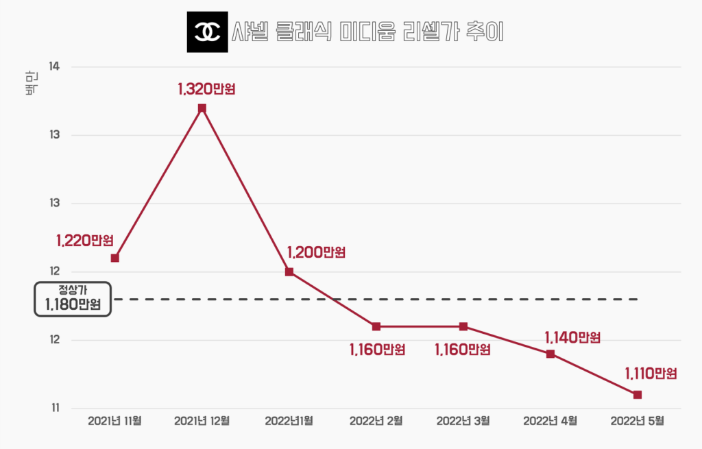 정상가마저 밑도는 샤넬의 리셀가는 명품 수요마저 감소하고 있음을 보여 줍니다 (데이터 출처: 크림)
