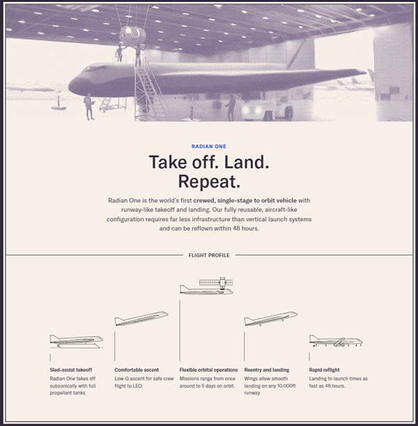 ‘레이디언 원(Radian One)’으로 이름 붙여진 이 우주비행기는 활주로에서 이륙해 지구 궤도 비행을 하고 난 후 활주로로 귀환하는 날개달린 1단 로켓 우주비행기다. 완전 재사용이 가능해 착륙후 48시간 내에 다시 지구궤도로 향할 수 있다.